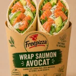 Tortilla de blé, saumon, avocat, sauce ciboulette, salade, tomate